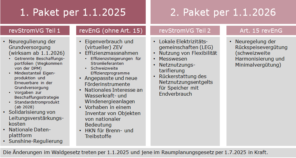 Wie der Bundesrat in der Medienmitteilung schreibt, soll der Strombranche mit der gestaffelten Inkraftsetzung genügend Zeit für die Umsetzung der Neuerungen gegeben werden. Die gestaffelte Inkraftsetzung ist aber nicht nur im Hinblick auf den Aufwand zu begrüssen, der durch die Umsetzung der zahlreichen Neuerungen bei den Verteilnetzbetreibern entstehen wird. Sie ist mit Blick auf die tarifrelevanten Vorgaben in Zusammenhang mit der Neuregulierung der Grundversorgung und des Messwesens auch notwendig. Diese Neuerungen wären auf den 1. Januar 2025 gar nicht umsetzbar gewesen.