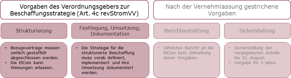 Zudem wird den Verteilnetzbetreibern nun generell vorgeschrieben, dass sie «Strategien für eine strukturierte Beschaffung festlegen, umsetzen und dokumentieren» müssen (Art. 4c revStromVV). Das bedeutet, dass die Definition dieser Strategien vorab erfolgen muss und ihre Umsetzung zu dokumentieren ist. Unter einer Strategie für eine strukturierte Beschaffung versteht der Verordnungsgeber bspw. zeitlich diversifizierte Standardprodukte (typischerweise über drei Jahre), Ein-Lieferanten-Strategien mit zeitlichen Tranchen und Formelpreis (Vollversorgung) oder Mehr-Lieferanten-Strategien mit Fest- oder scharfen Spotpreisen für Mehr- oder Mindermengen» (vgl. Erläuterungen zur StromVV, S. 14).